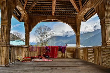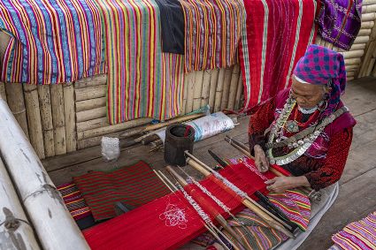 今年72歲的本央老人,是僜人服飾制作技藝西藏自治區(qū)級(jí)非遺傳承人。在西藏林芝市察隅縣沙瓊村,老人身著傳統(tǒng)的僜人服飾,在自家的涼亭里編織布料。