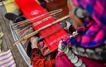 僜人俗稱(chēng)“僜巴”,是一個(gè)生活在我國(guó)西藏邊境的族群,人口較少。僜人有自己獨(dú)特的語(yǔ)言,生活方式簡(jiǎn)樸,起居穿戴有自己的習(xí)俗。僜人織品色彩艷麗,主色為紅色、粉紅色,由于沒(méi)有圖紙,每位織娘僅憑記憶織出腦海中的花紋,所以每一幅織品都獨(dú)一無(wú)二。