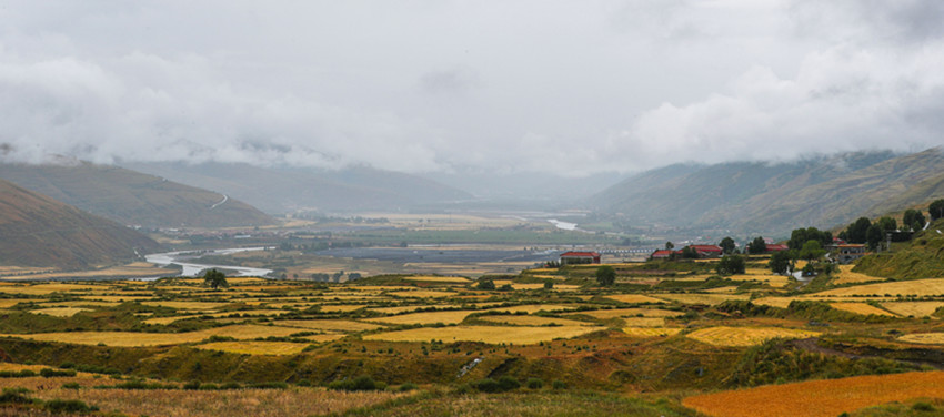 從立秋開始,陽氣漸收,萬物內(nèi)斂。在希望的田野上,主色調(diào)也從象征繁茂、成長的翠綠向代表成熟收獲的金黃漸變。爐霍縣蝦拉沱鎮(zhèn),藏房零星地點綴在田野間,成熟的農(nóng)作物漸染了整個秋季,讓這個小村莊如同一幅色彩斑斕的油畫。