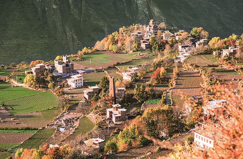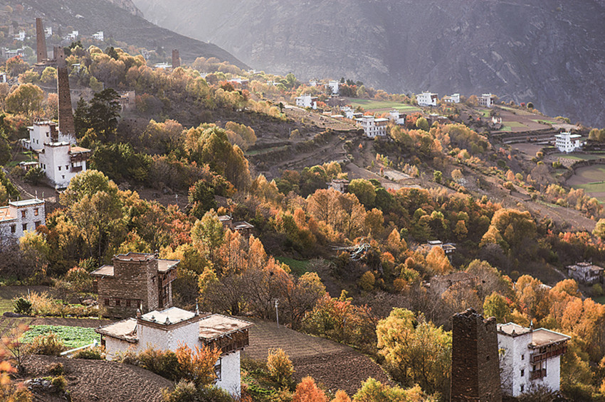 四季更迭,中路藏寨的魅力各異。秋天,正是藏寨最為絢爛的季節(jié)。造型獨(dú)特、別致的藏式民居,蜿蜒曲折的林間小道,組成了一幅美不勝收的畫(huà)卷。藏寨依山勢(shì)迤邐連綿,分布在相對(duì)高差近千米的山坡上,藏式樓房灑落在五彩斑斕的彩林中,與山谷、溪流、雪峰交相輝映,極富層次,構(gòu)成了一幅恬靜如詩(shī)的優(yōu)美畫(huà)卷。