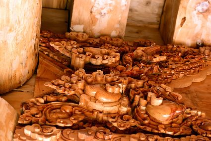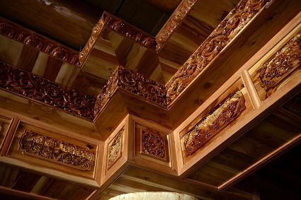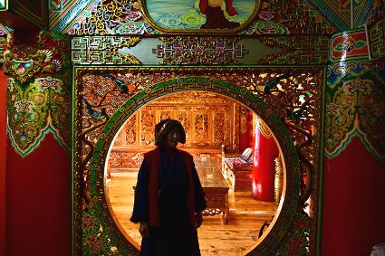 道孚民居的精華在其內(nèi)部,木材是其唯一的內(nèi)部裝飾材料,而裝飾,是一項(xiàng)繁瑣得曠日持久的藝術(shù)勞作,往往建房只需一兩個(gè)月,內(nèi)部裝飾則要幾年甚至幾十年。民間建筑藝術(shù)家們沉醉在細(xì)致入微的勞作里,讓每一個(gè)圖案都盈溢一份心底的吉祥,讓每一筆描摹都傳遞一份動(dòng)人的傳說(shuō)。房間四壁、房門和梁柱上一般都繪滿了精致典型的藏式壁畫(huà),窗上分別雕刻著龍、鳳、仙鶴、麒麟等吉祥圖案。每間屋的大門上都鑲嵌醒目的兩個(gè)獅頭大銅環(huán),凸顯了與之相融的漢文化的特點(diǎn)。置身其間,色彩斑斕中,身邊盡是龍飛鳳舞,鶴翔麟躍。繽紛中細(xì)端詳,真是藏民族藝術(shù)的天堂!