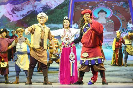 初生的音樂劇《康定情歌》是個(gè)聽話謙遜的孩童,專業(yè)人士的諄諄教誨一定會(huì)牢記在心;他也是個(gè)具有思鄉(xiāng)情結(jié)的游子,自己的一顰一笑都流露出濃郁的民族風(fēng)采;同時(shí)他也是個(gè)頑強(qiáng)拼搏的逐夢(mèng)少年,即便汗水和淚水匯成一道道溝壑,依然挺胸不低頭,只為在明天,成為更好的自己。 (圖片由州歌舞團(tuán)提供)