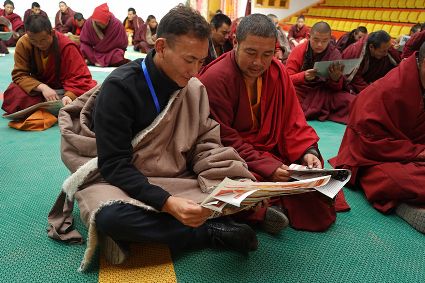 在贈科鄉(xiāng)扎西壩子,卡熱寺、達依寺、祖元寺、打莫寺、邦忠寺等不同教派的寺廟僧人和附近的村民齊聚一堂,聆聽十九大精神宣講。