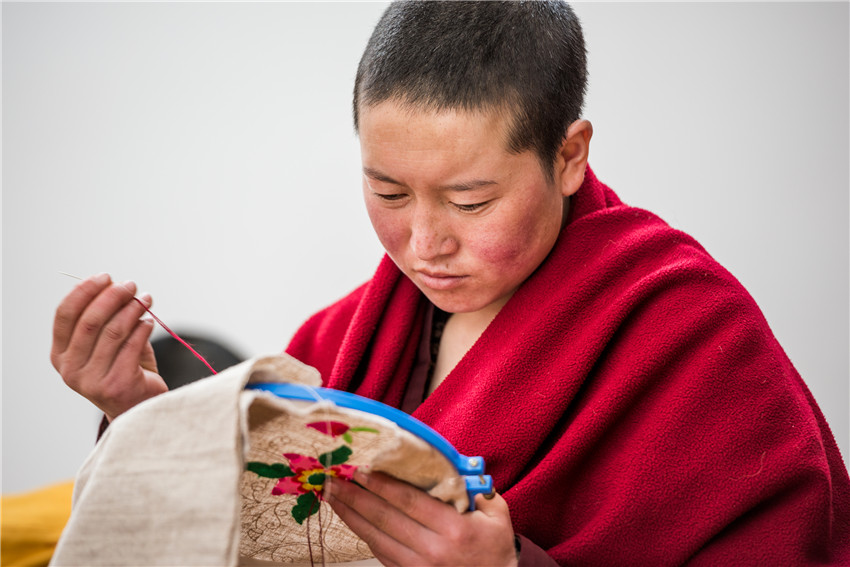 行攝途中經(jīng)過(guò)塔公鎮(zhèn)扎西寺,遇見(jiàn)康定市婦聯(lián)邀請(qǐng)到的中國(guó)國(guó)家級(jí)非物質(zhì)文化遺產(chǎn)藏羌織繡傳承人,正在為自愿報(bào)名的數(shù)十名覺(jué)姆傳授藏繡圖案基礎(chǔ)知識(shí)、藏繡圖案的常見(jiàn)表現(xiàn)形態(tài)、挑繡、納花繡、鏈子扣、扎花、提花、拼花、勾花和手繡等各種繡法技能。佛教的學(xué)習(xí)本是無(wú)止境的,我被這安靜、專注的場(chǎng)景深深感染,按下相機(jī)快門的一瞬就記錄了朵朵盛開(kāi)在指尖的蓮花。