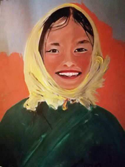畫畫三年多了。十三歲寫詩;到了高原后,方開始創(chuàng)作長篇小說。在上海,我做過畫廊。但要說斗膽動筆畫幅肖像。我是在白度母唐卡前燃了三炷香的。包括在咖啡店現(xiàn)場作畫。到京城繼而國外辦畫展,我認為都是因了我把畫布當成了詩稿的緣故。于是,大家喜歡我這種野路子,天馬行空,可又不舍方圓的創(chuàng)作手法。接下來,歐洲、東京還會有我的系列展覽。