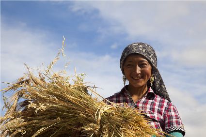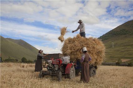 聯(lián)合收割機已在高原大地施展威力。那些平坦的大地里,拖拉機的穿梭,收割機的鳴唱,耳聞目睹,隨外可見。在山地間,大型機械無法進(jìn)入的地方,原始的勞作仍沒失去它本身的價值。“汗滴禾下土,粒粒皆辛苦”的場面仍然存在……農(nóng)人的歡歌喜語浸漫于天地間,豐收的喜悅早把辛勤的勞作沖淡。