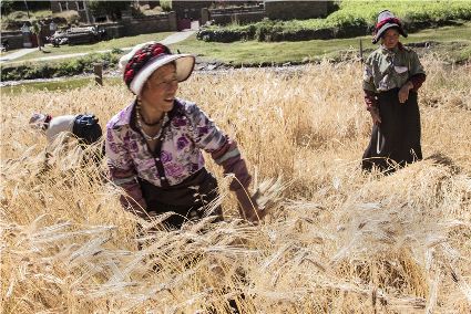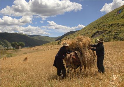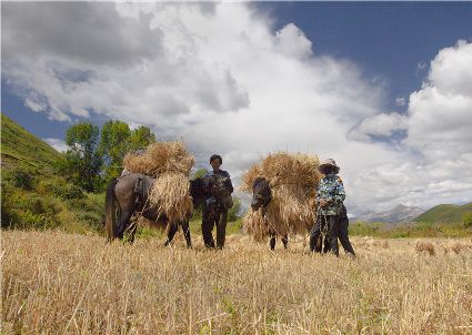 八月起迄,當(dāng)你翻越西出爐關(guān)第一隘口的折多山,下山十里就會看到山地田野里成熟的青稞、麥子象展開一頁頁金黃的詩篇涌進(jìn)眼里。那大地山坡起伏驛動的金箔等待著走進(jìn)主人的碉樓……這個時候,正是秋收的開始。
