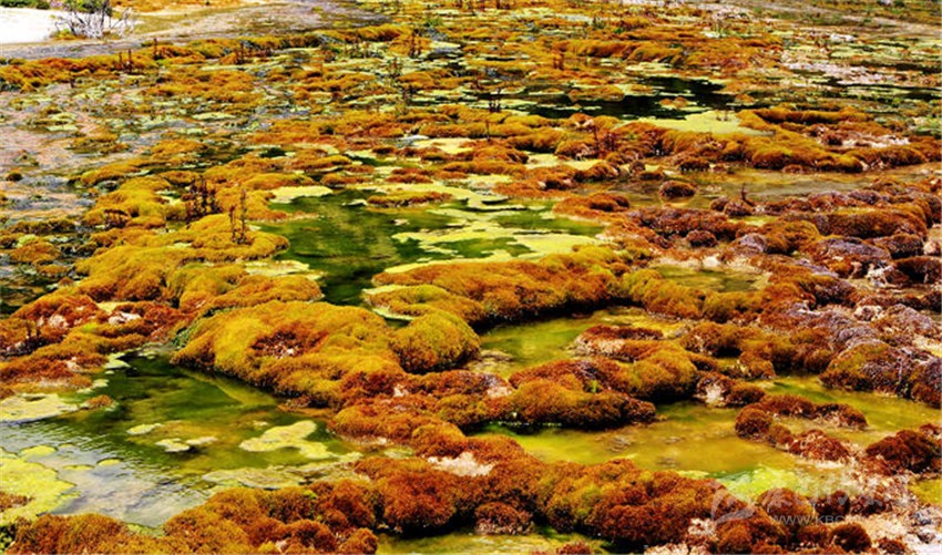 灘長約3000米,寬約200米,共有7個臺階,上面形成了大小不一的彩池,里面的各類水生植物,暢游的羌活魚(小鯢)等,給這片古老的地質(zhì)奇觀帶來了無限的生機。在海拔4300米處,有一眼噴出1.5米高的溫泉,水溫常年在30度左右,是玉龍泉華灘的主要水源。