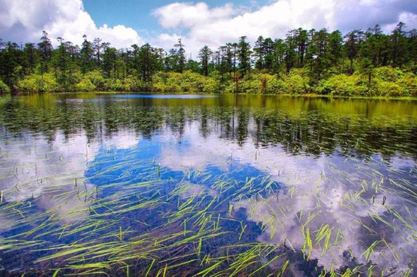 繼續(xù)前行,下一站既是木格措。木格措漢名:野人海,水源來自于身后女媧雪山的積雪融水,水質(zhì)清冽,能見度極高,湖四周群山環(huán)抱,紅海、黑海、白海等幾十個小海子圍繞在周圍,如眾星拱月般。木格措風光秀美,“臥虎觀月”、“雙霧墜?!钡染坝^最為獨特。