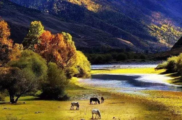 秋季,是稻城亞丁最具有詩意的季節(jié)。火紅、金黃、碧藍(lán)是自然這位大藝術(shù)家收藏已久最珍貴的顏料,這瞬間被洋洋灑灑潑灑在這天地之間。無論從什么角度看,取景框永遠(yuǎn)是一幅美麗的畫面。