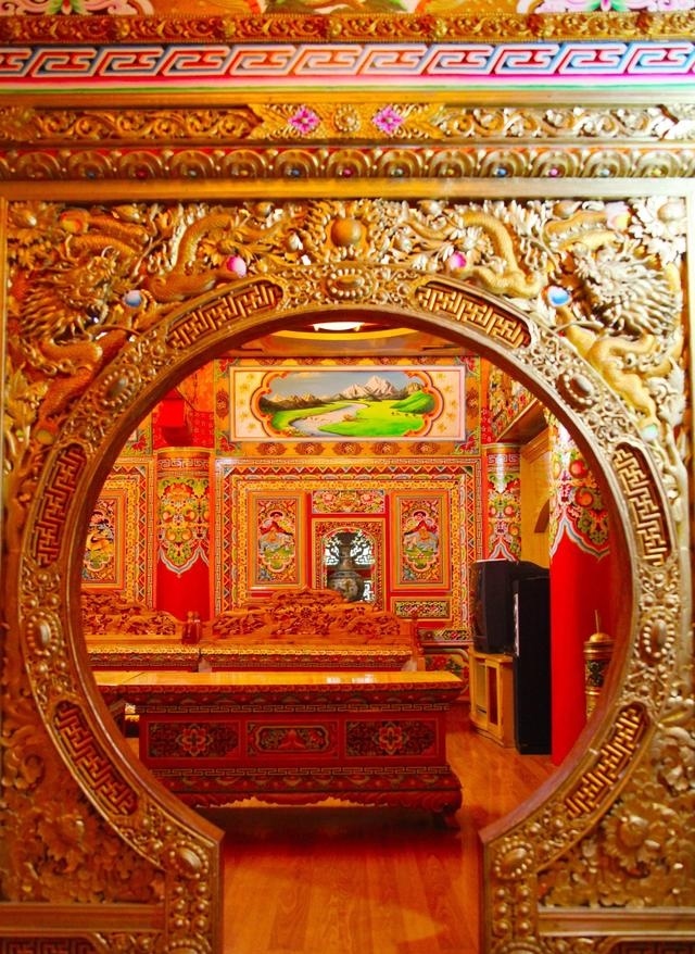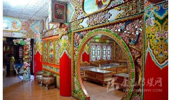 道孚民居室內(nèi)精雕細鏤,描金繪彩,每一個圖案或圖畫就是一個吉祥物或一個傳說。民居客廳陳設豪華,富麗堂皇,極顯主人的富有;經(jīng)堂供奉佛像,酥油燈長明,是家中的清靜之地;臥室多用箱式或椅式藏床,陳設溫馨而別具風情。