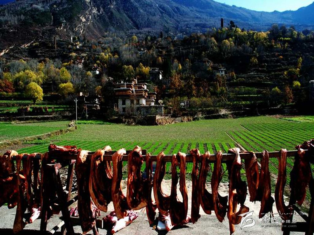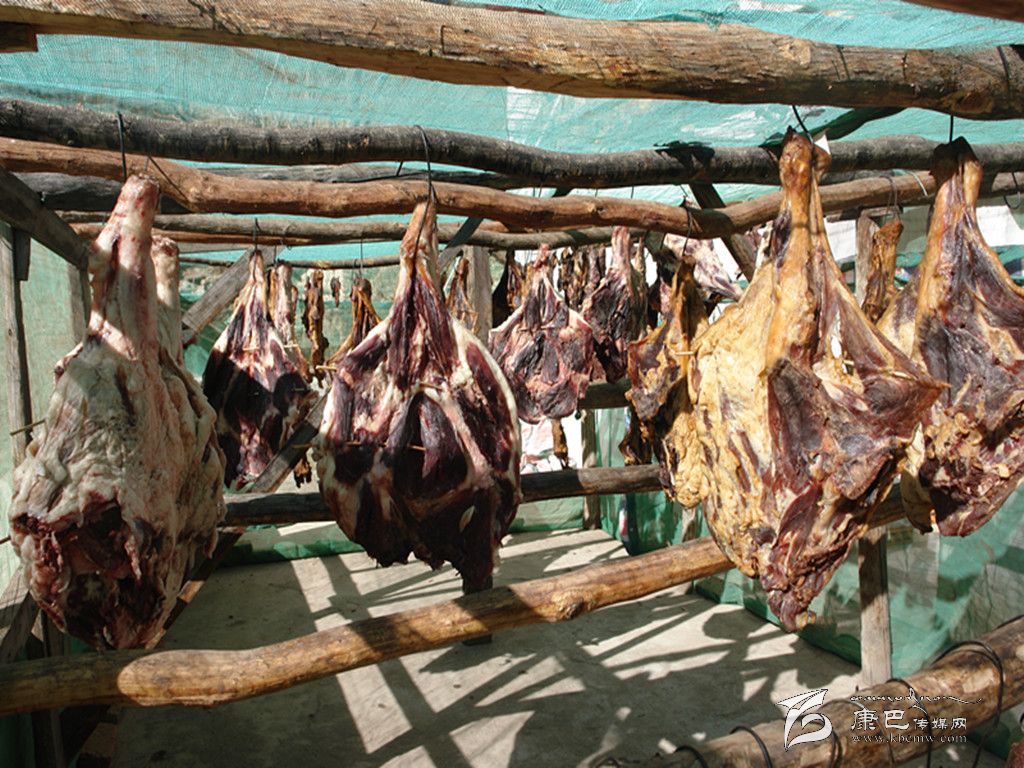 丹巴嘉絨藏族年期間,在酸菜包子、火燒饃、香豬腿等眾多的風味飲食中,“藏香豬腿”是必不可缺的美食佳肴,也是給長輩拜年和親朋好友間互送的最佳禮品。“藏香豬腿”的制作方式也象丹巴嘉絨藏族年一樣的獨特。丹巴人宰殺年豬的方式通常有用繩索死吊或者用刀從勁入殺心臟致死兩種,現(xiàn)在采用后一種方式宰殺豬居多。當?shù)厝藢⒇i宰殺后用熱水燙,處理好豬毛,再在胸口用刀開一孔,將手伸人胸腔扯斷心肺連接處,然后將其剖開,并把肥、瘦豬肉分離開,剝去板油,處理好其他內臟,將豬腿按原形分離,爾后經霜凍、柏枝熏、自然風干后存放在儲藏室內。豬腿存放一冬后,色、香、味俱佳。食用時煮成半熟或用炭火將表皮烘烤,切成小塊狀或撕成粉絲狀,在百米內即可聞到香味,入口鮮嫩清香,營養(yǎng)豐富,誘人食欲。