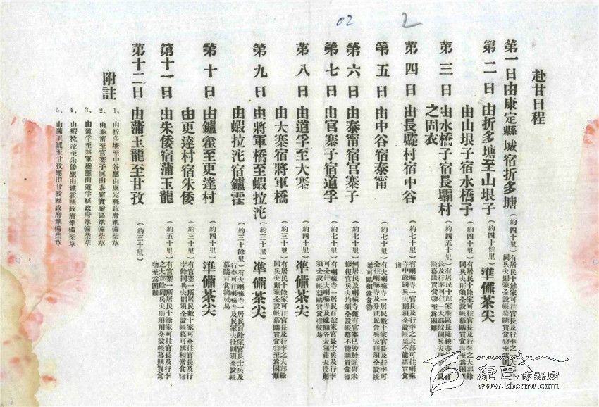 為了安排好戴院長(zhǎng)一行的行程,西康建省委員會(huì)專門發(fā)出了一份“訓(xùn)令”。這份時(shí)間表就是根據(jù)“訓(xùn)令”要求為戴院長(zhǎng)行程作出的安排。每天從何地到達(dá)何地,里程多少,休息地有無村莊、寺廟,接待力量如何、是進(jìn)房屋休息還是支帳篷都有說明,而且對(duì)沿途各縣各地提出了包括應(yīng)準(zhǔn)備柴草、應(yīng)在哪些地方準(zhǔn)備“打尖茶”(午飯)等具體要求。