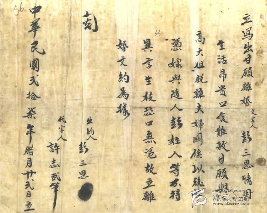 在這張“離婚文約”上看不出女方的任何態(tài)度和意愿,她仿佛只是一個影子,沒有了光源,影子也就不會存在。這位姓彭的男子雖是窮極潦倒之輩,身處社會底層,卻還是擁有對更為弱勢的曾經是自己的妻子“要還是不要”或者是“放與不放”的特權。