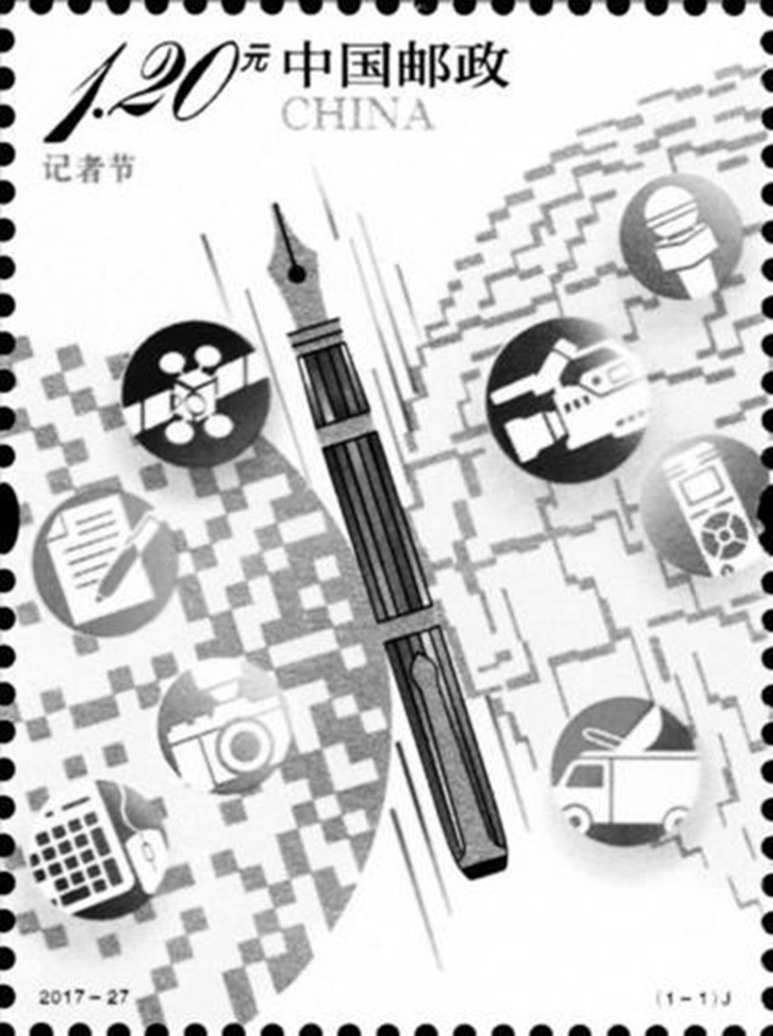 為紀(jì)念第18個記者節(jié)。中國郵政定于2017年11月8日發(fā)行《記者節(jié)》紀(jì)念郵票一套1枚。郵票圖案采用了具有現(xiàn)代感的構(gòu)成手法及色彩表達(dá)方式。畫面中的鋼筆象征了記者秉持弘揚民族精神、維護(hù)國家利益和社會責(zé)任的專業(yè)精神和自信風(fēng)范。兩側(cè)的線條及方點構(gòu)成的兩個圓形圖案分別隱喻地球和現(xiàn)代網(wǎng)絡(luò)體系,表示在新媒體時代,新聞傳播媒介所呈現(xiàn)出的多元化、全球化的發(fā)展態(tài)勢。畫面中麥克風(fēng)、攝像機、錄音筆等形式各異的采編設(shè)備圖標(biāo),結(jié)合衛(wèi)星及地面發(fā)射站等元素,突出了當(dāng)代記者巨大的社會影響力。同時,鋼筆和兩側(cè)的圓形圖案共同組成了一只振翅飛翔的蝴蝶形象,喻意了記者追求至善至美,在探訪報道中擔(dān)負(fù)著傳播先進(jìn)文化,引領(lǐng)和維護(hù)和諧社會,推動人類文明的崇高使命和社會責(zé)任。