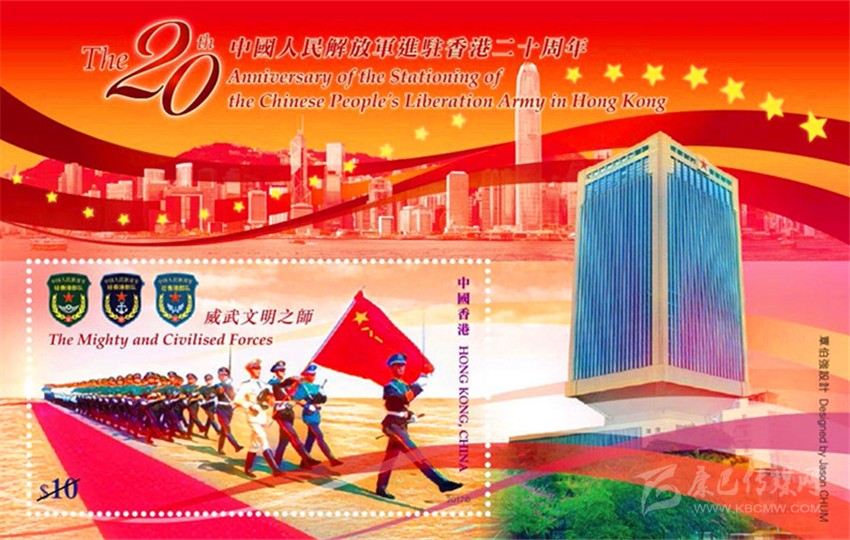 2017年6月20日,香港特別行政區(qū)郵政局發(fā)行了《中國人民解放軍進(jìn)駐香港二十周年》郵票小型張“威武文明之師”(圖7)。郵票主圖展示的是在“八一” 軍旗引導(dǎo)下,中國人民解放軍陸、海、空三軍儀仗隊的威武風(fēng)采。