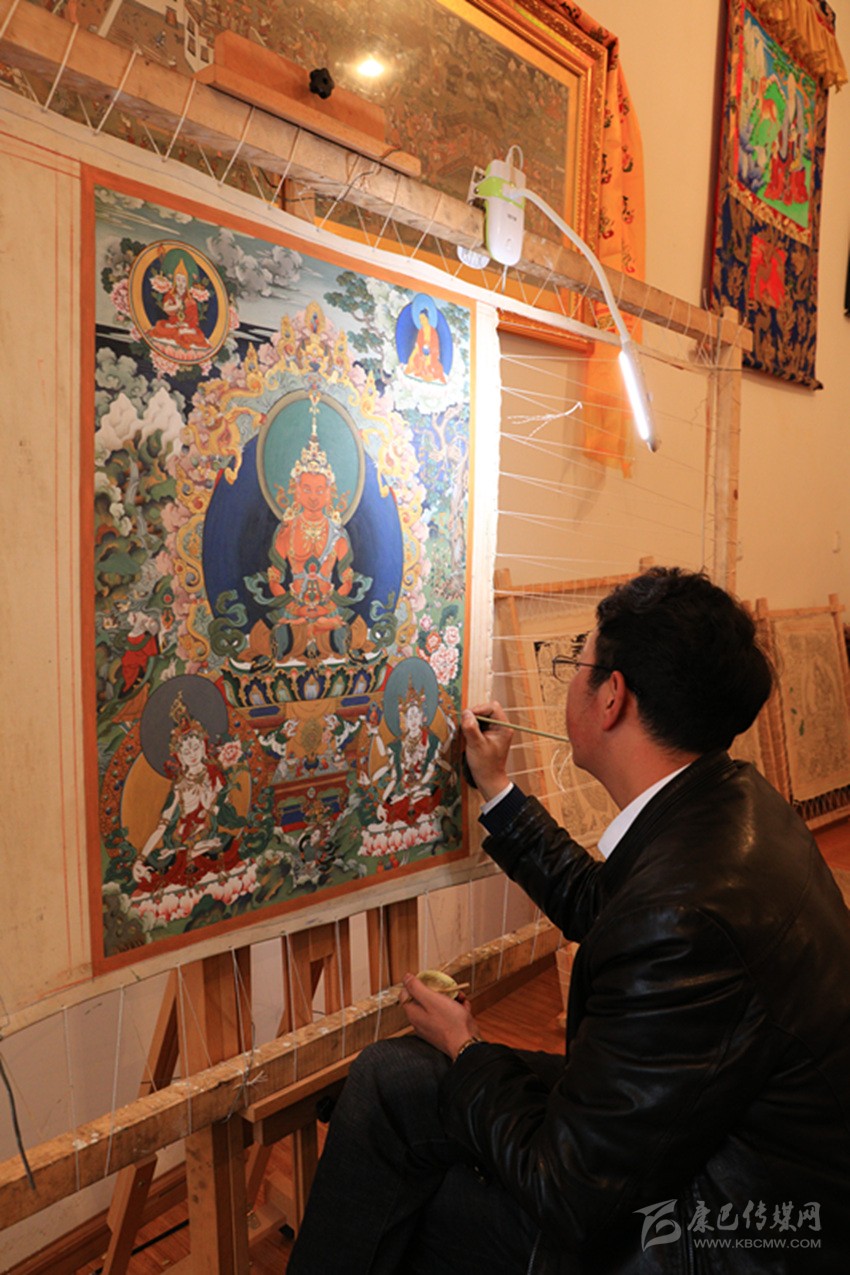 在師傅的教授下,著著從臨摹、勾線定型、著色染色、畫(huà)佛像一步步學(xué)起,對(duì)畫(huà)唐卡近乎癡迷地著著,在師傅的指點(diǎn)下學(xué)得特別認(rèn)真,他嚴(yán)格要求自己,把每幅畫(huà)都當(dāng)作品來(lái)完成。學(xué)習(xí)唐卡畫(huà)多則十余年,少則五六年,也許是著著的刻苦加天賦原因,僅三年時(shí)間便出師開(kāi)始獨(dú)立作畫(huà),到云南或鄉(xiāng)城周邊地區(qū)以畫(huà)壁畫(huà)、唐卡為生。