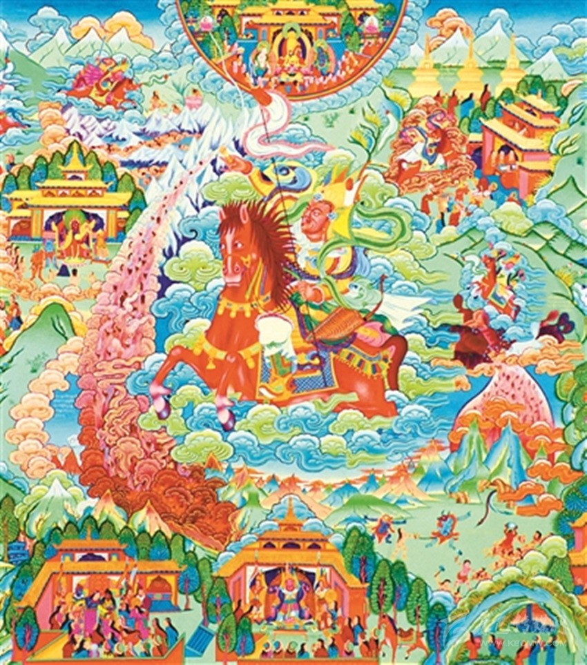 “中間世上各種紛爭”,講的是格薩爾從誕生到升天的全過程,這一部分,構(gòu)成了格薩爾的全部英雄業(yè)績,也是史詩的主體部分。