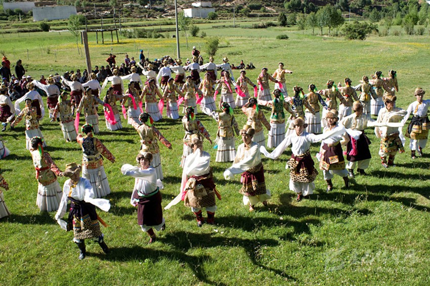這當(dāng)中最具有依憑的觀點是:“學(xué)羌”是藏族傳說人物江根阿坡創(chuàng)作的,他綜合了康巴三江沿岸的鍋莊與踏歌的舞步,又融入了滇西北少數(shù)民族的一些舞蹈元素。從歷史上看,得榮瓦卡(茶馬古道金沙江碼頭)曾是茶馬古道上的一座重鎮(zhèn),各民族的馬幫和商人曾集聚在瓦卡碼頭?;蛟S,人們常常在這里載歌載舞,久而久之,在碰撞和交流中慢慢融合出了一個新的舞蹈:學(xué)羌。