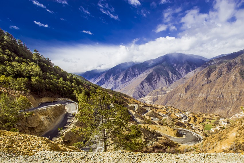 如今,所有鄉(xiāng)村通了硬化路,橫跨在金沙江上的十余座跨江大橋氣貫如虹,天塹變通途。過去我們下鄉(xiāng)時(shí),從日雨到曲雅貢,只有一條從因都?jí)伪澈蟮陌肷窖贰In茫大山,路上幾乎看不見一顆大樹,也找不到一滴水源。從山腰看江畔的因都?jí)?,只有兩戶人家,幾株綠樹總令焦渴難耐的我們望“綠”興嘆!下山走到金沙江邊,熾烈陽光從河灘上反射,火辣辣照在臉龐和皮膚,熱浪令人窒息,感覺目的地遙不可及?,F(xiàn)今,干部下村完全不需要走路,走路下鄉(xiāng)對(duì)年輕人來說簡(jiǎn)直不可思議。公路像一條飄帶環(huán)繞山間,使散落在峽谷中的村寨愈發(fā)展現(xiàn)出欣欣向榮的新風(fēng)貌。