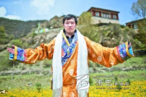 第一次穿上金色的藏裝,戴上潔白的哈達,感覺很奇妙,中國政法大學的趙丁在藍天白云下為自己留一張影。