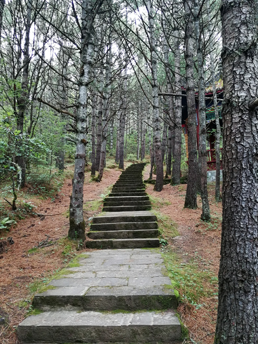 跑馬山腳的國(guó)道過境公路康定人都叫它后山公路。在后山公路觀音閣上行百米遠(yuǎn)地方,離公路坎三十公尺遠(yuǎn)近,有一處突兀于山坡樹林的巖頭,晃如一只臥獅探出的頭,那巖頭就是跑馬山獅子巖。此獅子巖自然不是彼獅子巖了。去四道巖的小徑就要從獅子巖傍邊經(jīng)過。那巖頭下如獅子的下頜處人為的砌了一個(gè)土石混合的條狀臺(tái)階,從我記事起就知道上面經(jīng)常供有一些食物瓜果紙張之類的供品。當(dāng)然那時(shí)候我們也常常把花紅、梨子放在那臺(tái)上,以示敬神。但具體敬的什么神靈或土地老仙,我則從未想過,這差不多就是一個(gè)習(xí)俗而已。