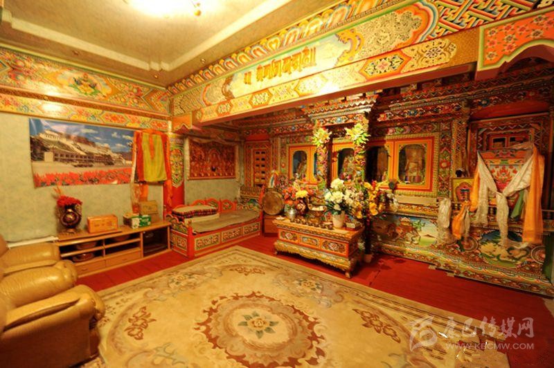 藏族居室一般分臥室、客廳、經(jīng)堂和廚房等部分。室內(nèi)陳設(shè)與裝飾如藏式建筑學(xué)者葉啟燊所言:“主次分明,重點(diǎn)突出。主室較為復(fù)雜而樸素,經(jīng)堂偏于華麗而清幽,其余各室均較簡(jiǎn)單。室內(nèi)都不施粉刷,但有個(gè)別的經(jīng)堂作雕刻裝飾;土司和喇嘛上層的經(jīng)堂則會(huì)作油漆的彩畫(huà)?!辈貐^(qū)不論是農(nóng)牧民住宅還是貴族上層府邸都有供佛的設(shè)施,經(jīng)堂屬于凈地,是專(zhuān)門(mén)供奉神佛的,因此,一般不作他用;主室是藏族住宅中最重要的一個(gè)房間,也是功能最多的房間,其中有生活、睡眠、飲食等所需的爐灶、壁櫥、壁架、矮桌、火盆等。這些藏式家具的布置安放,早已形成一定之規(guī)。
