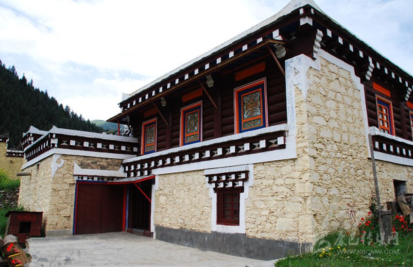 一般民居大門(mén)多為單扇,顏色為朱紅或?yàn)鹾?。有的人家門(mén)上釘三條銅質(zhì)或鐵質(zhì)的裝飾片,門(mén)上繪日、月、萬(wàn)字符圖案;門(mén)檐、窗檐用排列整齊的雙層排列方木從墻面上突出而成,上面掛上彩色短皺簾;門(mén)框、窗框兩側(cè)用寬約15厘米左右的黑條裝飾,窗子做成白色方格玻璃窗,二者色彩反差鮮明;門(mén)框木構(gòu)件上雕飾蓮花、疊卷等圖案,這種考究的門(mén)窗裝飾使得川藏線上的民居建筑體現(xiàn)出藏民族獨(dú)特的審美趣味,形成川藏線上一道饒有興味的人文景觀。宗教裝飾是藏居最為醒目的標(biāo)識(shí),外墻門(mén)窗上挑出的小檐下懸紅、藍(lán)、白三色條形布幔,周?chē)拇疤诪楹谏?,屋頂女兒墻的腳線及轉(zhuǎn)角部位則是紅、白、藍(lán)、黃、綠五色布條形成的“幢”。此五色分別寓示火、云、天、土、水,以此表達(dá)吉祥的愿望。