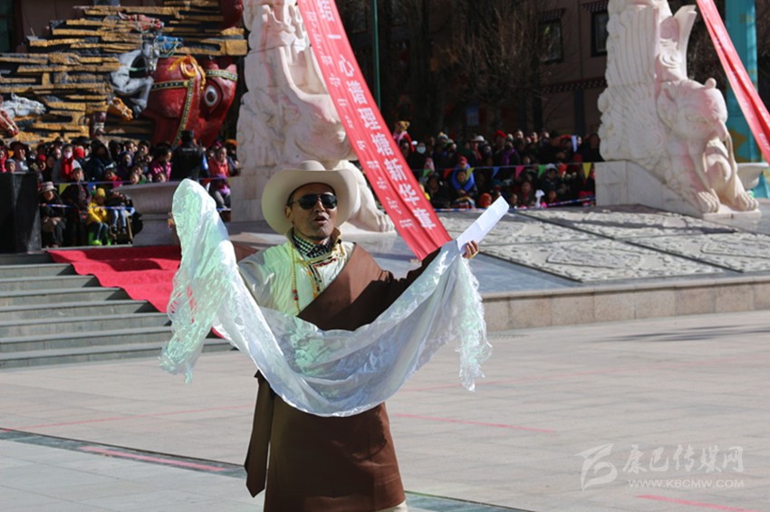 吉祥頌,藏語稱為“協(xié)巴”,是州級非物質(zhì)文化遺產(chǎn)之一?!皡f(xié)巴”在藏族民間生活中占有重要的地位,尤其在喜慶活動上,是一項不可或缺的重要儀式。州級非物質(zhì)文化遺產(chǎn)傳承人——高城鎮(zhèn)車馬村的翁堆老人手捧潔白的哈達(dá),為觀眾表演了《協(xié)巴——中國夢、理塘夢》,展現(xiàn)了時代變遷中,“吉祥頌”這一民間藝術(shù)在思想內(nèi)容和藝術(shù)手法的創(chuàng)新之美。