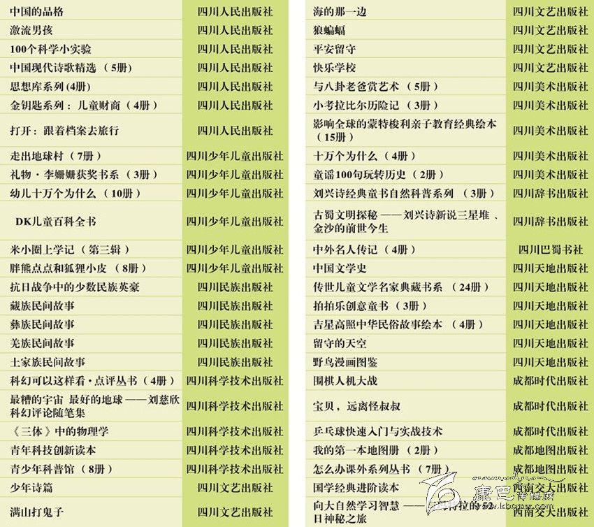 本網(wǎng)訊(張良娟)在“六一”兒童節(jié)來臨之際,省委宣傳部和省精神文明辦等聯(lián)合向全省青少年推薦《中國的品格》《激流男孩》等50種川版優(yōu)秀出版物。