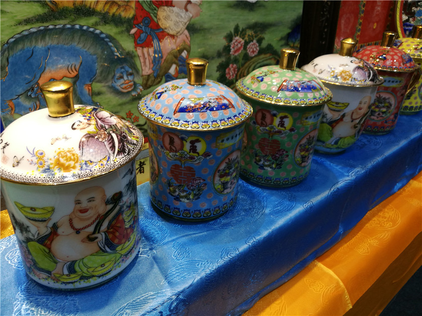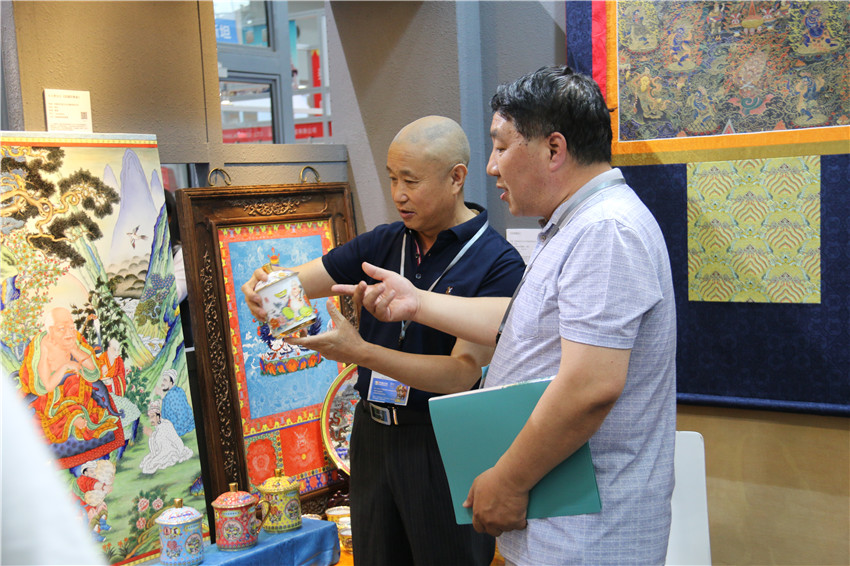 本網(wǎng)訊(記者 宋志勇 文/圖)“我是一次摔壞陶瓷,成就了我和馮建華藝術(shù)合作?!边@是參加第十四屆中國(guó)(深圳)國(guó)際文化產(chǎn)業(yè)博覽交易會(huì)上,來(lái)自爐霍縣華彩文化傳播有限公司參展商付國(guó)華這樣說(shuō),而在馮建華心里,雖然這是他的鎮(zhèn)館之寶,但他對(duì)付國(guó)華這位千里迢迢從甘孜藏區(qū)來(lái)到景德鎮(zhèn),感到自豪和高興,于是結(jié)下了深厚的感情,因此完成了唐卡與陶瓷藝術(shù)的完美結(jié)合——高溫粉彩瓷板。