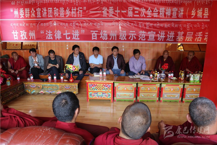 本網(wǎng)訊 按照州委統(tǒng)一安排部署,7月27日下午,州委群眾宣講團(tuán)深入色達(dá)縣色柯鎮(zhèn)東嘎寺開展了“州委群眾宣講團(tuán)和諧鄉(xiāng)村行”——省委十一屆三次全會(huì)精神暨“法律七進(jìn)”百場州級(jí)示范宣講進(jìn)基層活動(dòng)。