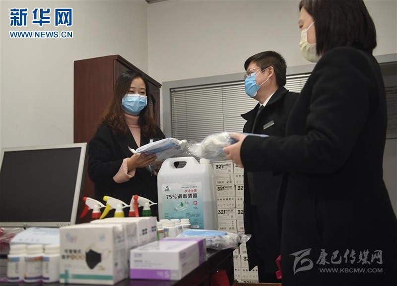 “女子服務(wù)隊”工作人員沈娜(左)向成都市金貿(mào)大廈物管公司管理人員了解防疫物資準(zhǔn)備情況(2月28日攝)。 新華社記者 劉坤 攝