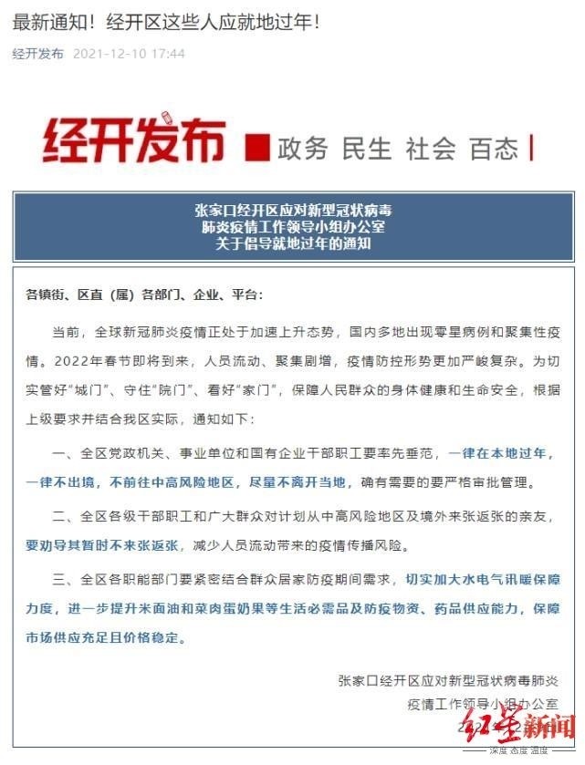 12月9日,河北張家口經(jīng)開區(qū)也發(fā)出通知:全區(qū)黨政機關(guān)職工等就地過年。通知中倡導(dǎo):全區(qū)黨政機關(guān)、事業(yè)單位和國有企業(yè)干部職工要率先垂范,一律在本地過年,一律不出境,不前往中高風(fēng)險地區(qū),盡量不離開當(dāng)?shù)兀_有需要的要嚴格審批管理。