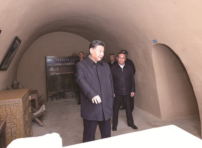 10月27日,中共中央總書記、國家主席、中央軍委主席習近平帶領中共中央政治局常委李強、趙樂際、王滬寧、蔡奇、丁薛祥、李希,瞻仰延安革命紀念地。這是習近平等在楊家?guī)X參觀毛澤東舊居。 新華社記者 鞠鵬 攝