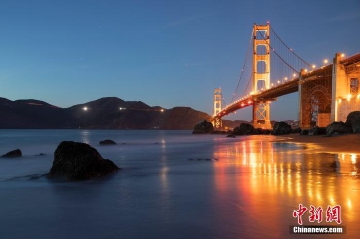 當(dāng)?shù)貢r間10月29日,美國舊金山金門大橋在海浪和夜色的襯托下美如一幅畫。中新社記者 劉關(guān)關(guān) 攝