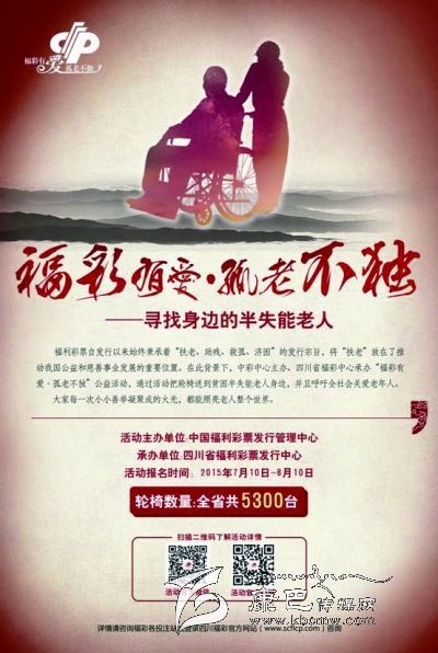 為踐行福利彩票“扶老、助殘、救孤、濟(jì)困”宗旨,州福彩中心將在全州范圍內(nèi)開(kāi)展“福彩有愛(ài)·孤老不獨(dú)”大型慈善公益活動(dòng),特向我州貧困半失能老人免費(fèi)贈(zèng)送福彩愛(ài)心輪椅。