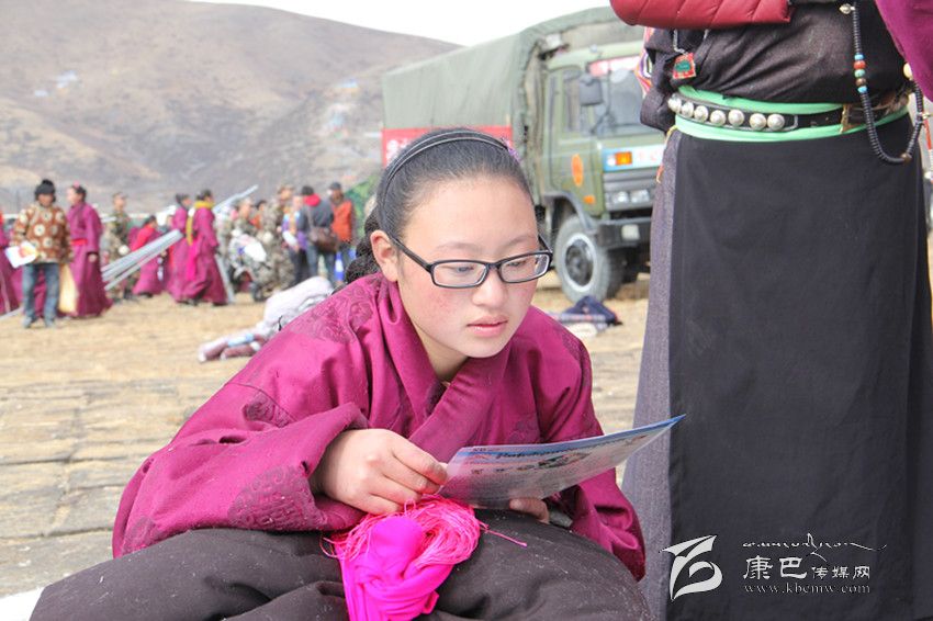 安置點(diǎn)小姑娘認(rèn)真翻看藏漢雙語(yǔ)健康宣傳資料。