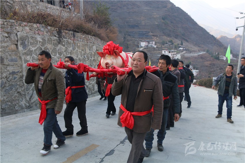 5個(gè)村民將年豬抬到秤上。360斤。村民為年豬準(zhǔn)備大紅花。準(zhǔn)備紙錢、香蠟。9點(diǎn)整,殺豬匠開始了他的工作,在眾人齊心協(xié)力下,光溜溜的年豬被打整干凈。“保佑我們村來年風(fēng)調(diào)雨順、五谷豐登,村民平安健康?!贝逯欣险呔催^天地后,8個(gè)身強(qiáng)力壯的村民站在年豬旁,豎著拇指齊聲說,今年家家戶戶還要養(yǎng)大肥豬。抬著年豬,村里的中老年人簇?fù)碇?,走在最前面,唱著悅耳的民謠,大意是歌唱幸福生活的,迎著2018年的第一縷陽光,村民們喜氣洋洋。到村里來的游客蜂擁拍照。