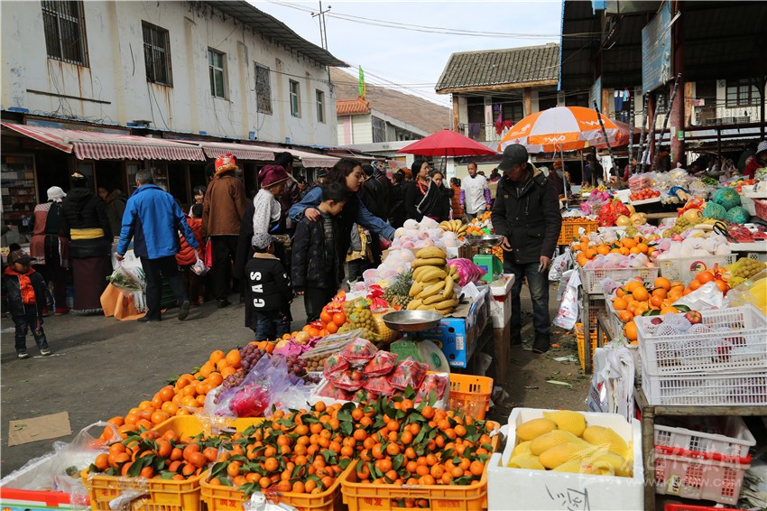 新都鎮(zhèn)格色村的丹真大哥和老伴兒其吉牽著8歲的孫子正在干果店里挑選各類干果,身后的背簍里水果、蔬菜、酥油、牛肉等農(nóng)畜產(chǎn)品以及中國結(jié)、年畫、對(duì)聯(lián)、掛圖等吉祥的節(jié)日物品應(yīng)有盡有。