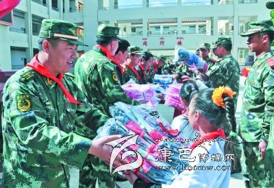儀式上,8722部隊(duì)向?qū)W校贈(zèng)送了價(jià)值萬余元的學(xué)習(xí)用品,拿著裝有鉛筆、水彩筆等各種文具的“愛心書包”,孩子們興奮不已。12歲的藏族女生登真啟珍告訴筆者:“今年的‘六一’兒童節(jié),武警部隊(duì)的叔叔們專門來看望我們,還送來了禮物,我感到特別開心。”儀式上,少先隊(duì)員們給參加慰問的部隊(duì)領(lǐng)導(dǎo)戴上鮮艷的紅領(lǐng)巾,孩子們還表演了精心排練的節(jié)目。一張張燦爛的笑臉,一陣陣蕩漾心扉的歌聲,傳遞著駐訓(xùn)武警部隊(duì)與當(dāng)?shù)厝罕姖鉂獾聂~水深情。