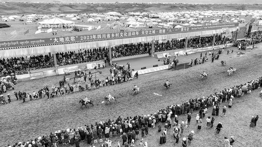 “中國藏族賽馬文化之鄉(xiāng)”“理塘八一傳統賽馬會”是四川涉藏州縣規(guī)模最大的賽馬會,賽馬傳統延續(xù)長達400余年?!霸缇吐犝f過馬背上的理塘,今天終于親眼所見,實在不虛此行。草原追風,策馬飛奔,蹄聲如雷,震徹山野,這是多么壯美的理塘萬馬奔騰圖?。《嘞脒h離城市的喧囂,策馬揚鞭,馳騁草原,豪邁瀟灑,勇往直前。以后每一年的理塘賽馬活動,我一定會帶上家人再來這里,因為理塘,可謂是心靈棲息的地方?!痹凇按蟮貧g歌”2023年四川省鄉(xiāng)村文化活動年——天空之城·理塘“八·一”賽馬會上,來自北京的游客石磊被當地賽馬文化吸引,和朋友玩得不亦樂乎。