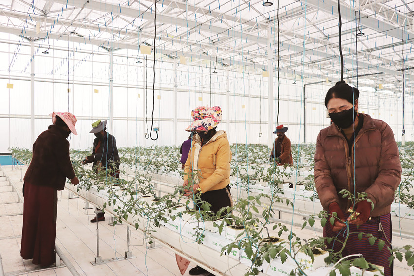 理塘縣甲洼鎮(zhèn)瑪吉阿米花園農(nóng)莊智慧農(nóng)業(yè)無(wú)土栽培館內(nèi),工人正忙著給番茄苗綁蔓、整枝、打杈等。