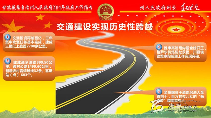 交通建設(shè)實現(xiàn)歷史性跨越。交通投資再破百億,建成三級以上路面2700余公里。雅康高速州內(nèi)段全線開工,格薩爾機場場址獲批,川藏鐵路雅康段前期工作實現(xiàn)突破。建成通鄉(xiāng)油路399.5公里、通村公路1499.6公里,新增農(nóng)村客運班線32條、客運站(點) 683個。全州國省干道路況進入全省前十。徹底告別無電鄉(xiāng)歷史。完成投資100億元,“電力天路”等項目順利實施,“川藏聯(lián)網(wǎng)” 工程提前半年建成投運;18個縣實現(xiàn)與主網(wǎng)連網(wǎng);“遠(yuǎn)村點亮”全面完成。城鄉(xiāng)面貌煥然一新。堅持建好縣城,全州市政基礎(chǔ)設(shè)施有效提升。堅持做大集鎮(zhèn),改造小城鎮(zhèn)危舊房1118戶;投入1.34億元完善姑咱、馬尼干戈、香格里拉、八美4個省級“百鎮(zhèn)試點”鎮(zhèn)市政設(shè)施,13個鄉(xiāng)獲準(zhǔn)撤鄉(xiāng)建鎮(zhèn)。堅持做美村寨,成功創(chuàng)建45個省級“美麗鄉(xiāng)村”示范村,19個州級幸福美麗新村試點建設(shè)全面啟動,打造新村聚居點235個,建成藏區(qū)新居1.11萬戶。全州城鎮(zhèn)化率達(dá)到27%。通信覆蓋越來越廣。完成投資4.53億元,國省干線和主要旅游景區(qū)通信網(wǎng)絡(luò)實現(xiàn)連續(xù)覆蓋。生態(tài)底色更加鮮明。編制完成《甘孜州生態(tài)文明建設(shè)規(guī)劃》,落實國家生態(tài)功能區(qū)轉(zhuǎn)移支付資金6.8億元,生態(tài)保護與建設(shè)工程加快推進,草原植被、森林覆蓋率分別達(dá)到78%、33.04%。