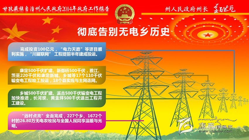 大力推進電力通信建設(shè)。投入20億元,加快實施“電力天路”、無電地區(qū)電力建設(shè)新增項目和農(nóng)網(wǎng)改造升級工程,切實緩解邊遠(yuǎn)地區(qū)群眾缺電問題;完成長河壩電站500千伏等3個輸變電項目;統(tǒng)籌抓好表后入戶工程,確保群眾安全用電。投入6億元,新建通信光纜2360公里、基站1025個,解決國省干道、旅游景區(qū)景點信號盲區(qū);新增30個自然村通電話、545個行政村通寬帶,出口總帶寬達(dá)到82G。