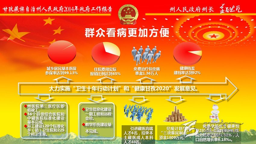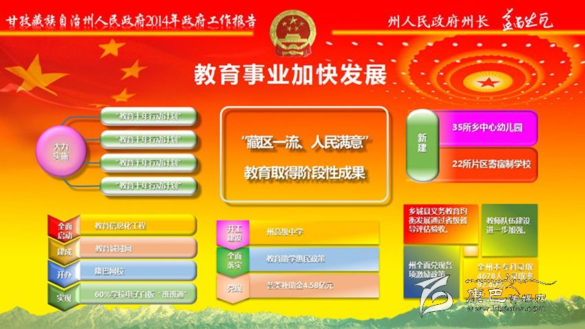加大民生投入,全年民生支出139億元。全州城鎮(zhèn)新增就業(yè)7400人,城鄉(xiāng)低保實現(xiàn)應(yīng)保盡保;在全省民族地區(qū)率先實施醫(yī)療保險制度城鄉(xiāng)統(tǒng)籌,異地就醫(yī)即時結(jié)算全面啟動;在全省率先出臺大病醫(yī)療保險規(guī)定。教育事業(yè)加快發(fā)展。新建35所鄉(xiāng)中心幼兒園、22所片區(qū)寄宿制學(xué)校,州高級中學(xué)開工建設(shè)。全面落實教育助學(xué)惠民政策,兌現(xiàn)各類補助金4.58億元。城鄉(xiāng)居民基本醫(yī)保參保率達(dá)到99.13%,健康檔案建檔率達(dá)到92%;開工建設(shè)120個標(biāo)準(zhǔn)化鄉(xiāng)(鎮(zhèn))衛(wèi)生院和225個村衛(wèi)生室;衛(wèi)生信息化建設(shè)一期工程和遠(yuǎn)程會診、教學(xué)系統(tǒng)建設(shè)基本完成;兌現(xiàn)計劃生育“三項惠民制度”資金1809萬元。群眾文化生活日益豐富。建成縣“兩館”12個;開工建設(shè)州民族體育館、州農(nóng)牧民演藝培訓(xùn)中心和14個縣級全民健身中心,建成農(nóng)民體育健身工程739個;開展 “送文化下鄉(xiāng)”近千場;康巴文化研究院“四大工程”全面啟動。深入實施“百千萬康巴英才工程”,人才科技工作扎實有效。扶貧移民工作成效明顯。完成1360個貧困村、19.91萬扶貧對象立卡建檔工作;實施整村推進63個、連片開發(fā)項目4個、彝家新寨(村)17個、索改橋23座,易地扶貧搬遷9850人,2.65萬群眾生產(chǎn)生活條件得到改善。
