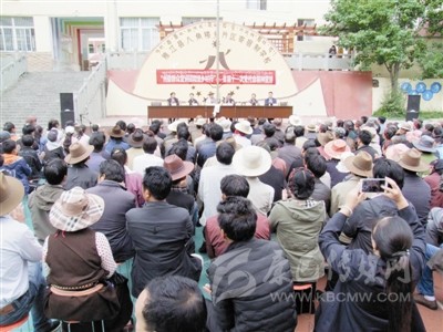 在雅江縣河口鎮(zhèn)希望小學的廣場上,來自全鎮(zhèn)各村的430名群眾齊集一堂,認真聆聽宣講團成員其美貢布和劉美翁姆的宣講。