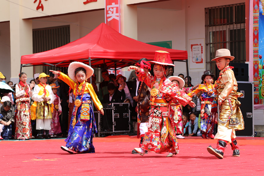在縣城小,孩子們隨著民族音樂特有的旋律舞動身姿,踏著歡樂的舞步跳起鍋莊,讓人仿佛置身于大草原。孩子們還穿著各式各樣的藏式民族服裝進(jìn)行了一場服飾秀表演。
