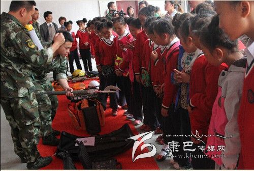 師生們在康定縣消防中隊(duì)副中隊(duì)長李勇的帶領(lǐng)下,參觀了消防員宿舍、榮譽(yù)室、軍人俱樂部等。官兵們“豆腐塊”的被子引起了學(xué)生們濃厚的興趣和強(qiáng)烈的好奇心。不少孩子親自動(dòng)手,嘗試在消防官兵的指導(dǎo)下學(xué)習(xí)疊“豆腐”被子,并進(jìn)行了內(nèi)務(wù)整理。在消防器材展示環(huán)節(jié),師生們走進(jìn)車庫,中隊(duì)官兵介紹了各類消防器材裝備的名稱、性能和使用方法以及各類消防車、隔熱服、避火服、防化服和背戴空氣呼吸器等特勤器材的性能和使用方法。在消防安全課堂上,官兵們向?qū)W生們播放了《校園消防安全警示錄》,并結(jié)合實(shí)際向同學(xué)們講解了學(xué)校防火的重要性、火場逃生自救方法、初期火災(zāi)的撲救、滅火器的使用、如何報(bào)火警等基本消防知識。在聯(lián)歡活動(dòng)現(xiàn)場,消防官兵傾力打造的舞蹈《小蘋果Style》贏得同學(xué)們滿堂喝彩,現(xiàn)場響起熱烈的掌聲。學(xué)生們帶來的《吉祥中國結(jié),美滿中國夢》跳出了小朋友們的美滿幸福之情。文藝演出的最后,消防官兵們還為學(xué)生們帶來了消防時(shí)裝秀,穿著各式服裝的消防戰(zhàn)士閃亮登場,向孩子們講解了這些服裝在各種災(zāi)害事故現(xiàn)場的用途。