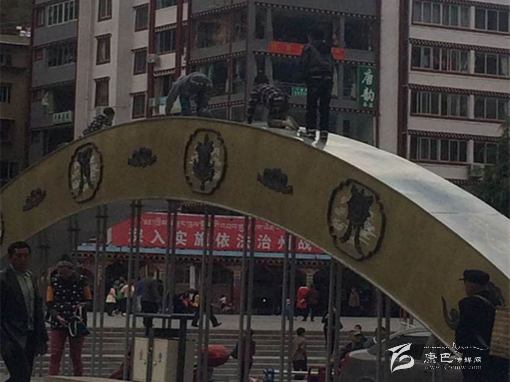 在康定劇場(chǎng)前面的廣場(chǎng)上,每天傍晚,廣場(chǎng)舞大叔大媽都準(zhǔn)時(shí)前來(lái)報(bào)到。孩子們則在人群中玩耍。7歲的陽(yáng)陽(yáng)(化名)被奶奶帶著來(lái)到廣場(chǎng)上學(xué)習(xí)滑旱冰,滑著滑著小伙伴出現(xiàn)了。脫掉冰鞋,陽(yáng)陽(yáng)和大家一起開(kāi)始在“康定情歌”歌譜造型的漢白玉雕塑上攀爬。奶奶則在廣場(chǎng)另一端和老友擺龍門(mén)陣,根本無(wú)暇顧及。“征服”了“康定情歌”以后,陽(yáng)陽(yáng)和伙伴們繼續(xù)“征服”康定劇場(chǎng)臺(tái)階前的大塊漢白玉雕塑。“趕快下去,這些娃娃真沒(méi)得家教!”一位愛(ài)管閑事的中年人制止了孩子們的“不文明”行為。他離開(kāi)后,陽(yáng)陽(yáng)再次奔向漢白玉雕塑……